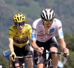 Tadej Pogačar (à direita) e Jonas Vingegaard (à esquerda) durante o Tour de France de 2022. filip bossuyt de Kortrijk, Bélgica • CC BY 2.0
