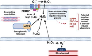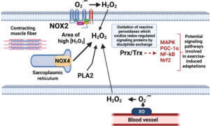 Durante o exercício, o aumento da taxa metabólica acelera o fluxo de elétrons na cadeia transportadora mitocondrial, levando à formação de espécies reativas de oxigênio como o ânion superóxido (O₂•–) e o peróxido de hidrogênio (H₂O₂).