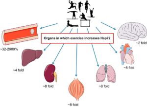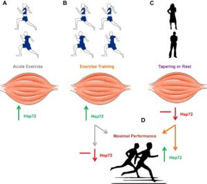 Exercício Agudo: Estímulos agudos de exercício aumentam a expressão de HSP72 em múltiplos tecidos, incluindo músculo esquelético, cardíaco, fígado, cérebro, rim e pulmões. Os principais estressores fisiológicos do exercício — aumento da temperatura corporal, estresse oxidativo, hipóxia, alterações do pH, fluxos de cálcio e depleção de substratos energéticos — ativam o fator de choque térmico 1 (HSF1), que regula a transcrição de genes codificadores de HSPs.